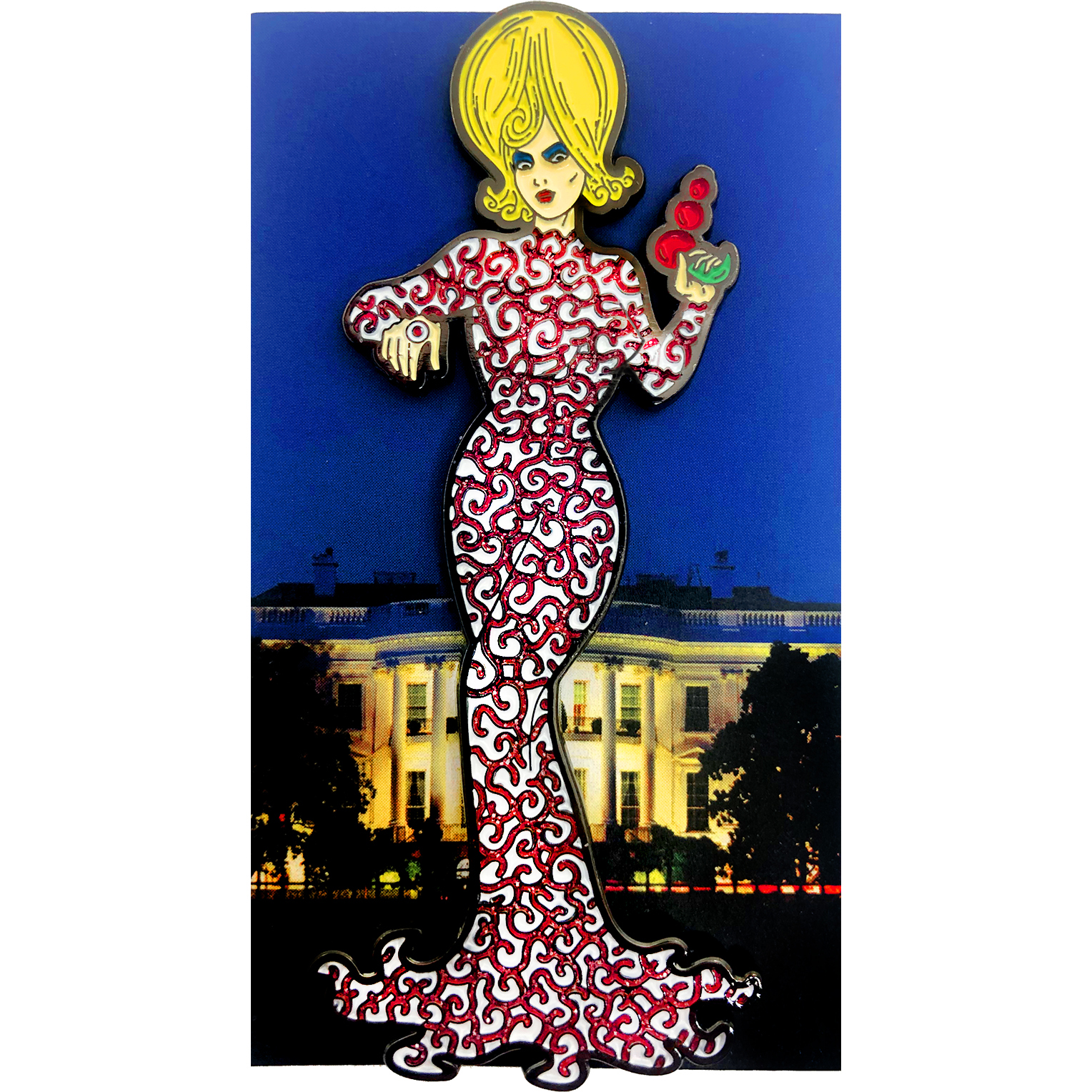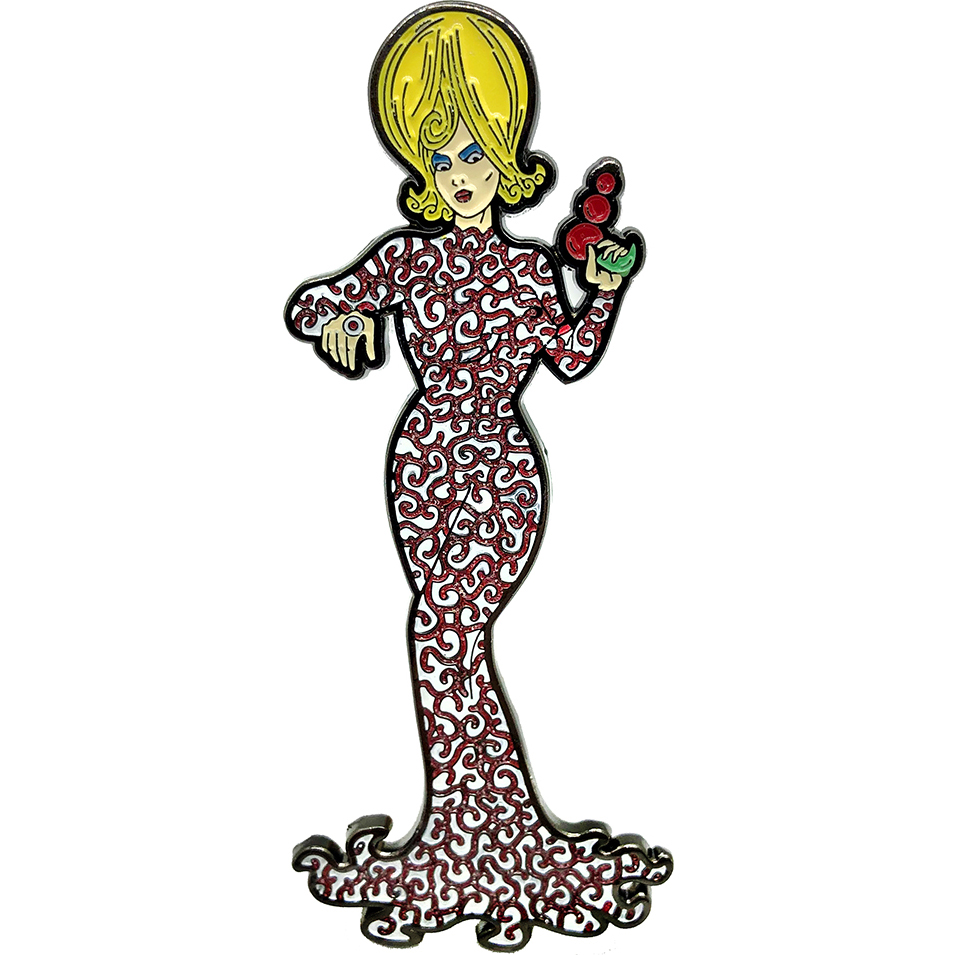 3.5" full metal lapel pin with Red glitter in dress.