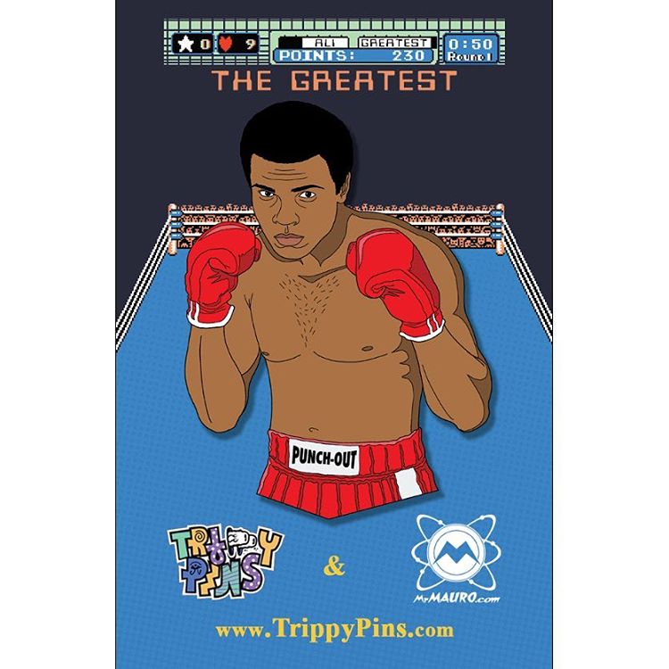 Dedicated to the greatest, this is a mash up i did with a Punch out style theme and Ali. Fun to wear this one and I designed the pin back like the fighting level :-)