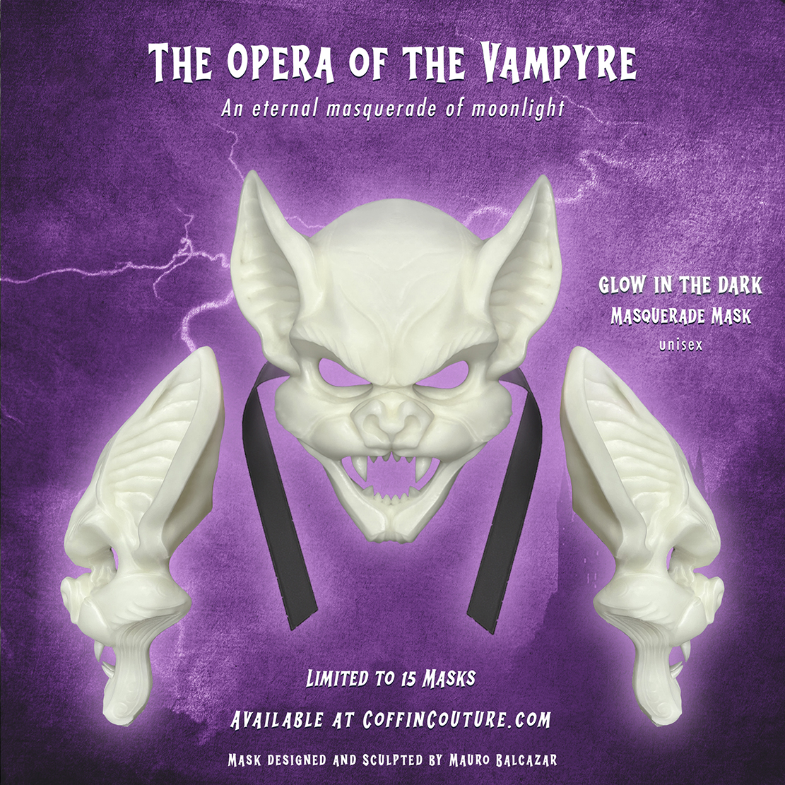 Step into the masquerade with this custom-sculpted creation, inspired by Victorian opera and vampiric lore.